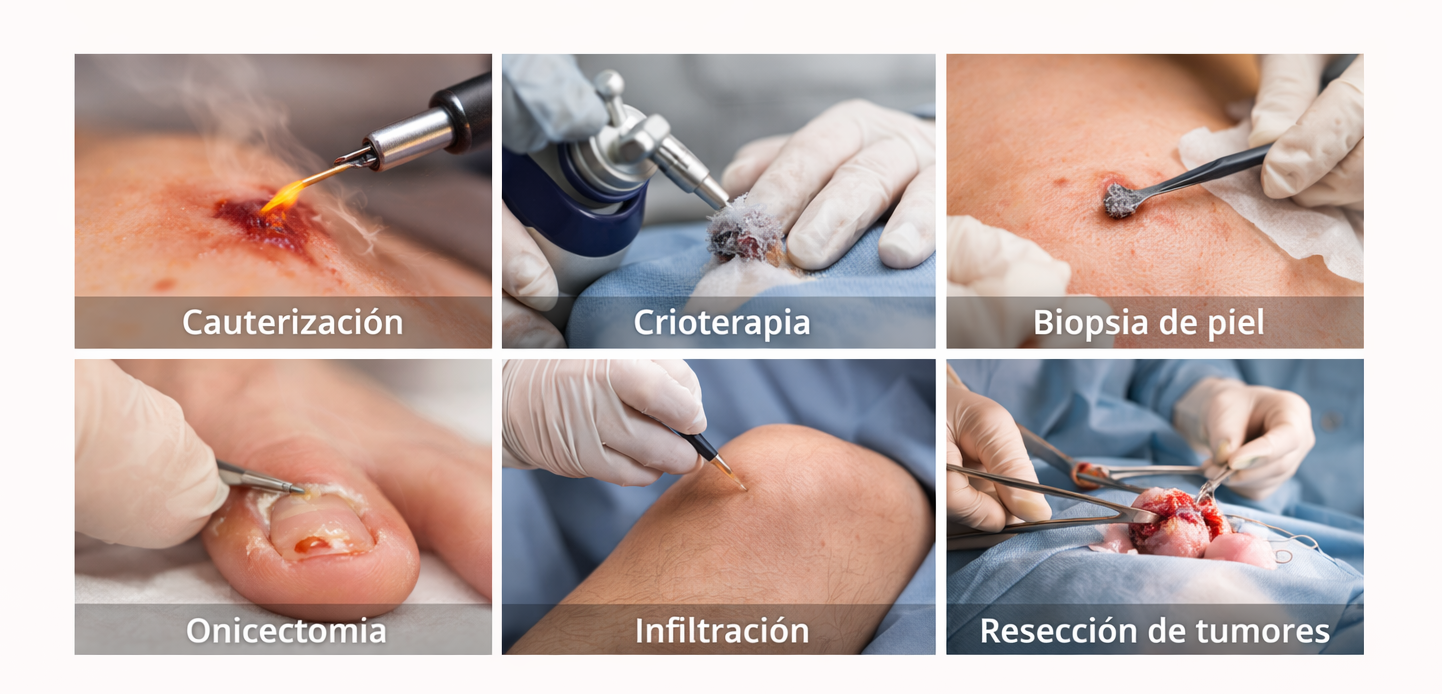 Cauterización, crioterapia, biopsia de piel, onicectomía, infiltración y resección de tumores.