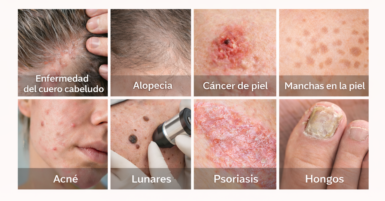 Enfermedades del cuero cabelludo, alopecia, cáncer de piel, acné, lunares, psoriasis, hongos y verrugas.
