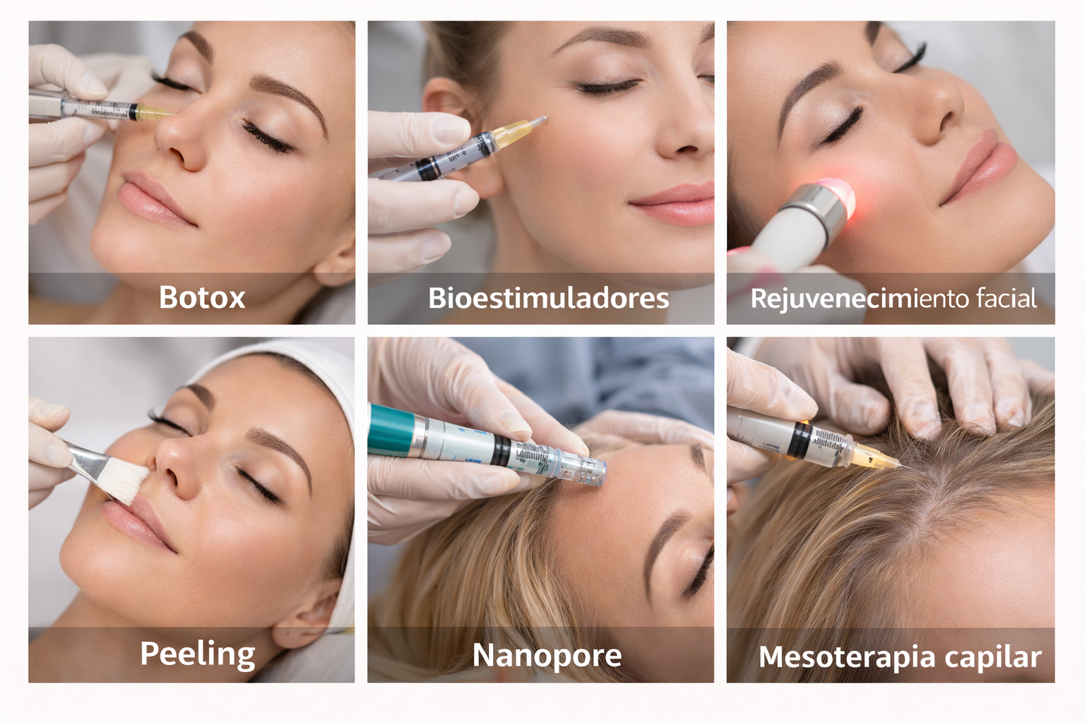 Botox, bioestimuladores, rejuvenecimiento facial, peeling, nanopore, mesoterapia capilar e Hydrafacial.